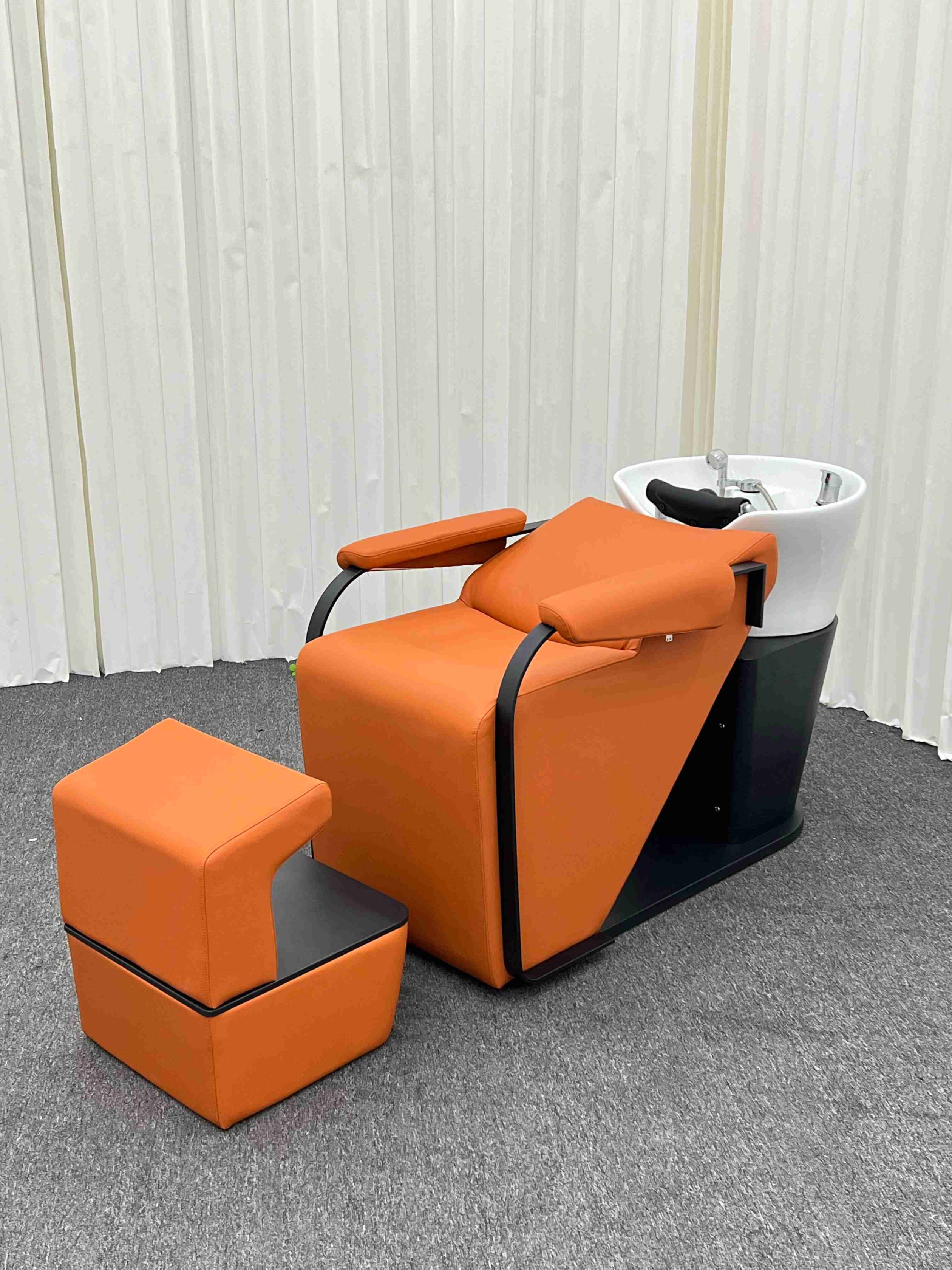Lit shampoing Gloria Édition Orange & Noir Mat Le lit shampoing Gloria transforme chaque moment de lavage en expérience premium. Sa silhouette inclinée en cuir PVC orange premium, sa structure en acier laqué noir mat et son repose-pieds assorti inclus offrent au client un confort total et une expérience visuelle mémorable. Le bassin en céramique blanche avec douchette et robinet intégrés complète un équipement pensé pour l’excellence professionnelle.
