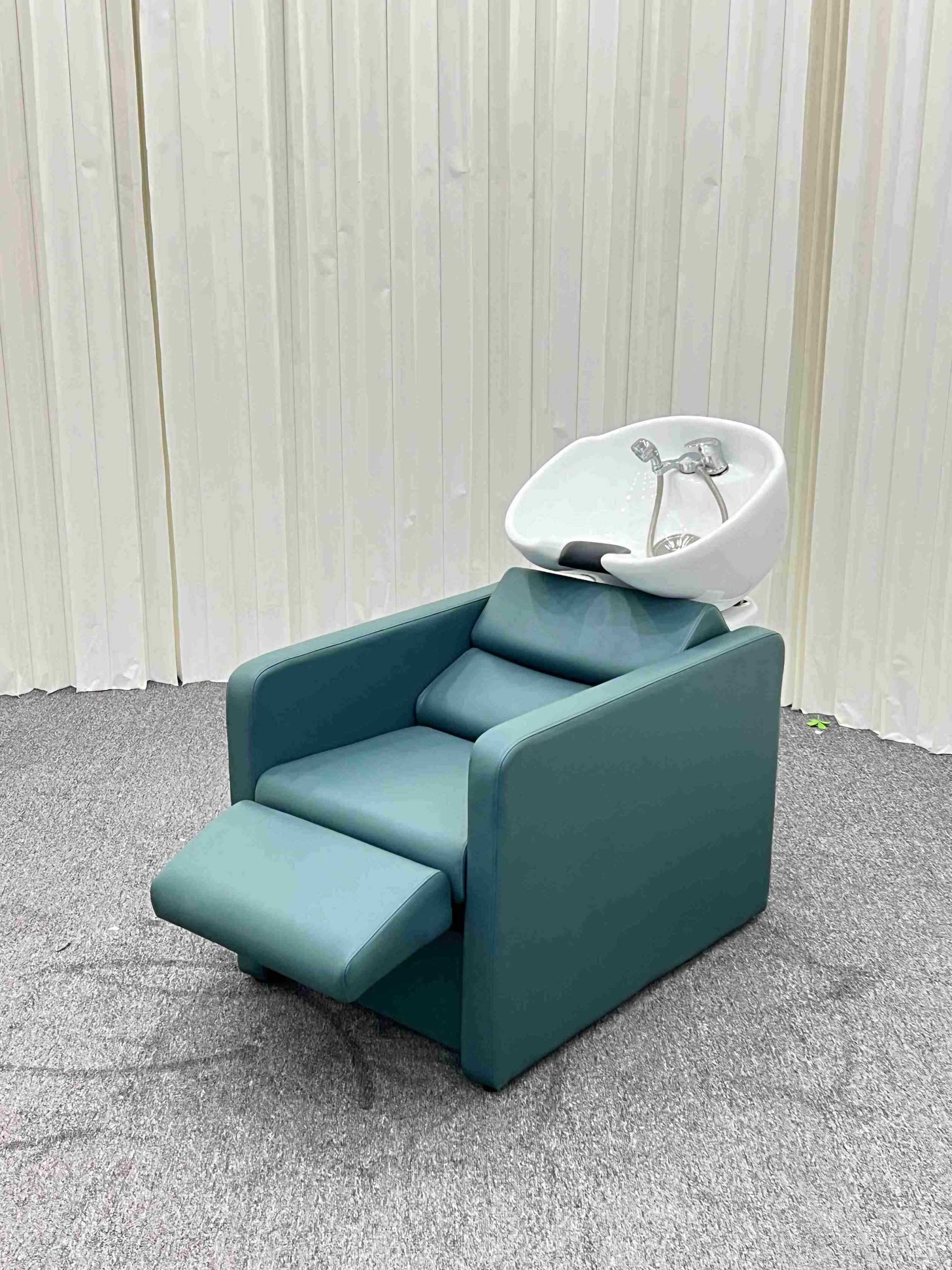 Lave-tête Yori Édition Vert Canard Le lave-tête Yori allie confort premium et design épuré dans une couleur profonde et sophistiquée. Son fauteuil cubique aux lignes nettes en cuir PVC vert canard premium, ses accoudoirs larges et son repose-pieds intégré escamotable garantissent un confort professionnel total au client. Le bassin en céramique blanche avec douchette et robinet intégrés complète un équipement pensé pour la performance.